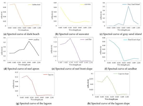 Evidently, in the dark beach, the blue band reflectivity reached a peak of 0.092; from the blue band to the red band, the reflectivity dropped sharply to reach a minimum value of 0, and it recovered slightly in the near-infrared and short-infrared bands. Next, the reflectivity of seawater was extremely low, the absorption capacity was strong, the maximum value of the reflectivity, 0.041, appeared in the coastal band, and the reflectivity of the other bands for the stabilization was 0.01. Further, the gray sand island is covered by vegetation and sand. A small reflectance peak of 0.059 at 0.561 μm, a slight decrease at the red band, a maximum reflectance peak of 0.509 at the near-infrared band, and a sharp decrease at short-infrared band can be noted. The reflectance of the reef flat showed an increasing trend at coastal, blue, and green bands, reaching a peak of 0.238 at the green band, and showed a decreasing trend, approaching 0 at the near-infrared band. The reflectance of the front slope of the reef reached a peak of 0.055 in the coastal band and rapidly decreased to a value near 0 in the blue, green, and red bands, with a slight rebound in the near-infrared and short infrared bands and a small peak at 1.609 μm. The spectral curve of the sandbar showed an increasing trend from the coastal, blue, green, and red bands to near-infrared bands, the reflectance reached a peak of 0.525 in the near-infrared band, and it began to decline at the short-infrared band. The spectral curve of the lagoon rose from the coastal band to the blue band and dropped from the blue band to the red band, and the reflectance tended to 0.003 at the near-infrared and short-infrared bands. The spectral curve of the lagoon slope dropped in the wavelength range of 0.443–0.483 μm, rose in the interval of 0.483–0.561 μm, reached a maximum of 0.089, and dropped rapidly between 0.516 μm and 0.865 μm to reach a minimum of 0.001, with a slight recovery in short-infrared bands.