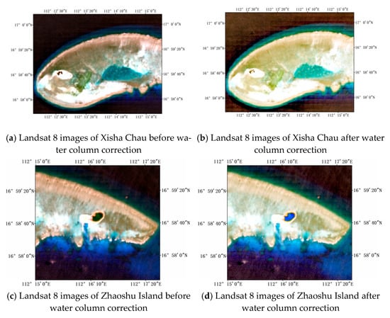 Water depth is an important factor affecting the identification of coral reef information. To accurately identify spectral information and correct the reflectance errors caused by seawater on shallow water substances, water column correction is required. Lyzenga proposed a semi-empirical method for correcting water depth, which approximates the relationship between bottom reflectance and the depth index as a linear function, thereby linearizing the depth attenuation effect and establishing the corresponding radiative transformation [19,20]: