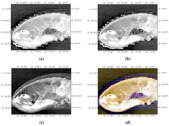 The best-band-combination map of Zhaoshu Island. Combinations of (a) Zhaoshu Island bands 3 and 4; (b) Zhaoshu Island bands 2 and 4; (c) Zhaoshu Island bands 1 and 2 combination; and (d) Zhaoshu Island bands 3 + 4, 2 + 4, and 1 + 2.