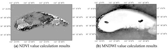 The primary criterion for selecting feature data is the spectral differences in penetration ability between different wavelengths. In this study, the near-infrared band, red band, green band, mid-infrared band, blue band, and thermal infrared band were chosen as the feature bands to construct a decision tree classification model applicable to Landsat 5, Landsat 7, and Landsat 8. Additionally, the model employed the Normalized Difference Vegetation Index (NDVI) and the Modified Normalized Difference Water Index (MNDWI) to distinguish vegetation from seawater [29,30,31]. The calculation results of the feature bands are shown in Figure 10, where Figure 10a presents the NDVI values and Figure 10b presents the MNDWI values, with results indicating that the MNDWI effectively distinguishes between seawater and bare land.