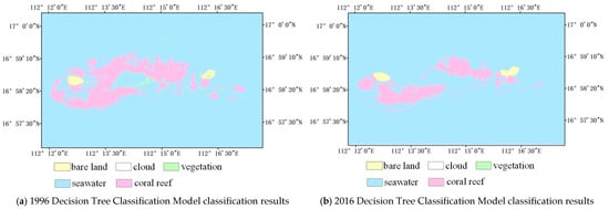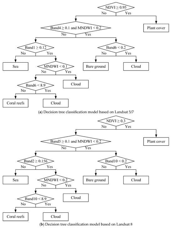 The construction of the decision tree classification model mainly includes three steps: feature band selection, decision tree model generation, and decision tree model pruning. The decision tree is a tree-like structure established based on various features, where leaf nodes represent different material categories. The construction criteria for the decision tree model are simplicity and good performance. In this study, the decision tree algorithm was used for the supervised classification of the shallow seabed in the study area, achieving the identification of bare land, vegetation, seawater, coral reefs, and clouds [26,27,28].