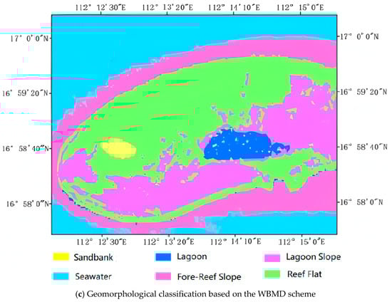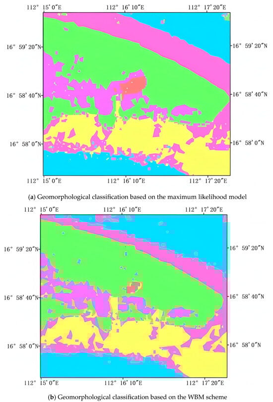 - The WBMD scheme was established and applied. To further improve the classification accuracy of the maximum likelihood classification model, the WBMD scheme was proposed, resulting in enhanced classification accuracy. Comparative analysis revealed that the overall accuracy of geomorphological classification for Xisha Chau and Zhaoshu Island based on the WBMD scheme was 97.07% and 95.07%, higher than the WBM scheme’s 96.71% and 94.81% and the maximum likelihood classification model’s 87.56% and 92.30%, indicating that the WBMD scheme has higher classification accuracy and is beneficial for coral reef information extraction.