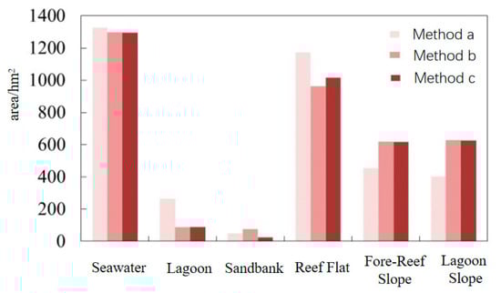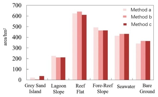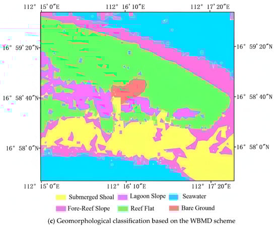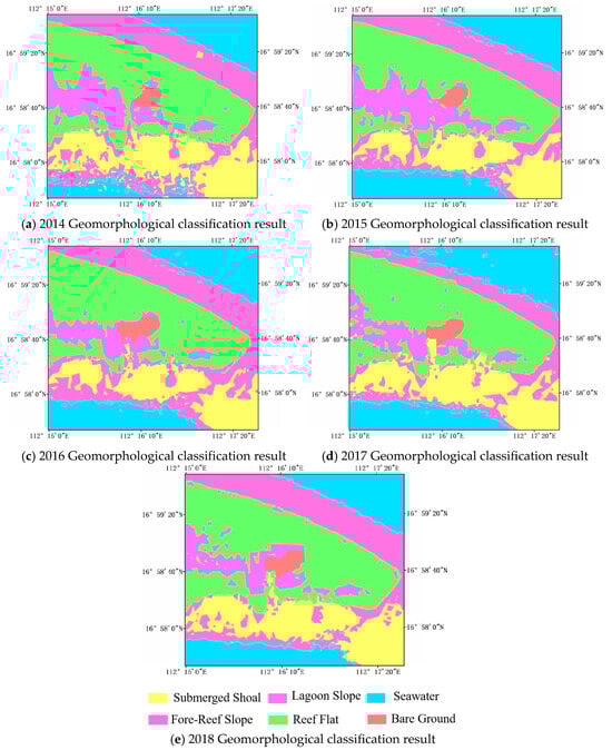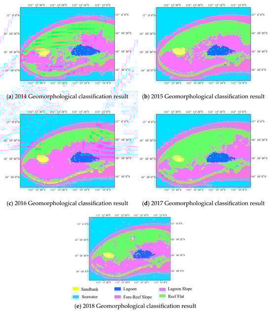 Based on Landsat 8 imagery from 2014 to 2018, geomorphological classification was performed using the WBMD scheme to obtain coral reef geomorphological information maps of Xisha Chau (see Figure 18). Figure 18a–e present the coral reef identification results of Xisha Chau for 2014, 2015, 2016, 2017, and 2018, respectively. The figures show that the changes in the six geomorphological types of Xisha Chau were relatively minor over this period.