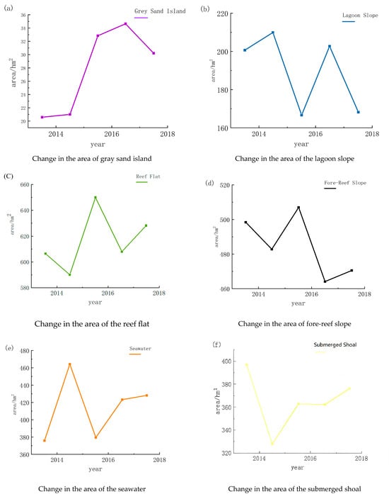 Area statistics for different geomorphological types of Xisha Chau were analyzed (Figure 19), and the following can be clearly seen: (1) the area of seawater fluctuated slightly from 2014 to 2018, but was overall more stable; (2) the area of the lagoon area showed a general downward trend, indicating that the lagoon has a tendency to shrink, and the lagoon shrinking year by year will have a certain impact on the growth of coral reefs; (3) the sandbar area is affected by wind and seawater, showing a wave-like fluctuation change; (4) there is a certain complementary relationship between the reef flat and the lagoon slope, with the reef flat area observing its lowest value and the lagoon slope observing its peak in 2016; (5) the change curve of the area of fore-reef slope showed a wave-like change in increasing, then decreasing, then increasing, and then decreasing, with the maximum peak occurring in 2017.