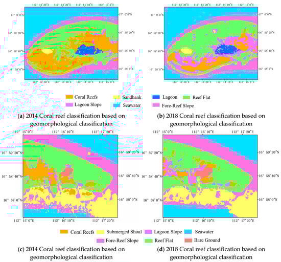 In combining the decision tree classification model for the coral reef classification of Zhaoshu Island and Xisha Chau with the WBMD scheme for geomorphological classification, a coral reef change analysis based on geomorphological classification was obtained (Figure 22). Panel (a) presents the coral reef distribution of Xisha Chau in 2014 based on geomorphological classification, panel (b) presents the coral reef distribution of Xisha Chau in 2018, panel (c) presents the coral reef distribution of Zhaoshu Island in 2014 based on geomorphological classification, and panel (d) presents the coral reef distribution of Zhaoshu Island in 2018. From the figures, the following conclusions can be drawn: (1) In 2014, the coral reefs largely overlapped with the lagoon slope geomorphological zone (a), indicating that coral reefs on Xisha Chau and Zhaoshu Island were mainly distributed in the lagoon slope area. (2) In 2018, the distribution range of coral reefs expanded (b), but the overall area of coral reefs decreased, indicating severe coral reef degradation and bleaching on Xisha Chau and Zhaoshu Island, which calls for enhanced protection and restoration efforts for coral reefs.