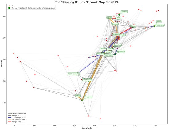 East and Southeast Asia port inter-port route network map in 2019.