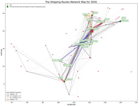 East and Southeast Asia port inter-port route network map in 2020.