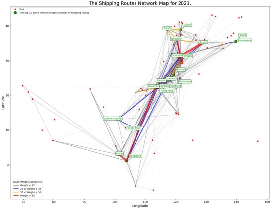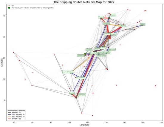 Temporally, the fundamental structure of the route network remained relatively stable between 2018 and 2022. However, the distribution of frequency weights and the strength of links between ports exhibited adjustments in response to external environmental changes. In 2018 (Figure 1, the network was comparatively balanced, with fewer high-weight routes, primarily those connecting Singapore–Shenzhen, Ningbo–Shanghai, and Shanghai–Busan, reflecting a more dispersed pattern of intraregional trade activities. By 2019 (Figure 2), high-weight routes began to concentrate between China and East and Southeast Asia’s core ports, indicating a strengthening of regional economic ties. Despite the disruptions caused by the pandemic in 2020 (Figure 3), the overall structure of the network remained resilient, though the links between some medium- and low-weight routes weakened. In 2021 (Figure 4), with the gradual recovery of global trade, there was a significant increase in the weight of routes, particularly high-frequency routes between international hubs. By 2022 (Figure 5), the network had further evolved, with an expansion of medium- and low-weight routes, suggesting a full recovery and the growth of regional trade. However, certain ports, such as Mumbai and Cochin in India, continued to exhibit weak connectivity within the network.