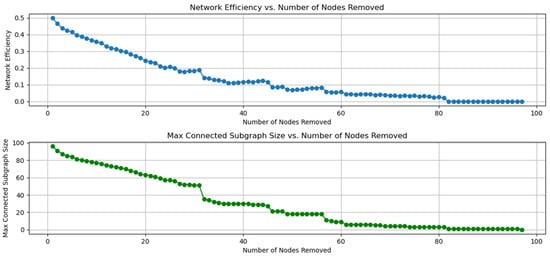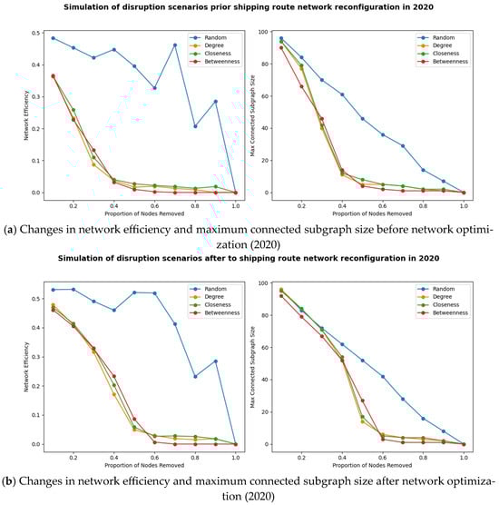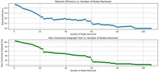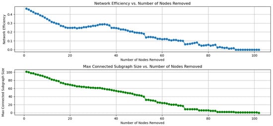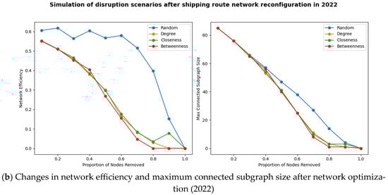 Finally, port resilience can be assessed by comparing changes in network efficiency and maximum connectivity subgraph size after a port outage. When the port is gradually interrupted, these two indicators will also gradually decrease, and the reduction degree reflects the overall robustness of the network [22]. The port interruption with poor resilience will lead to a significant decrease in network efficiency or the maximum connectivity subgraph scale, while the port interruption with strong resilience has little impact on the network. By interrupting different ports, significant changes in network efficiency can be observed, identifying the ports that are critical to network efficiency and which, if disrupted, can significantly reduce logistics transmission efficiency. In the maximum connectivity subgraph scaling analysis, removing ports identifies key ports that maintain network connectivity, which may cause the network to split into multiple isolated subgraphs, severely disrupting the connectivity and functionality of the network.