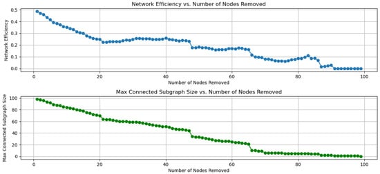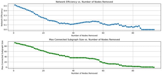 The maximum connected subgraph size denotes the quantity of interlinked nodes inside a substantial subgraph of the network, which varies when nodes become disconnected, illustrating the extent of network fragmentation.