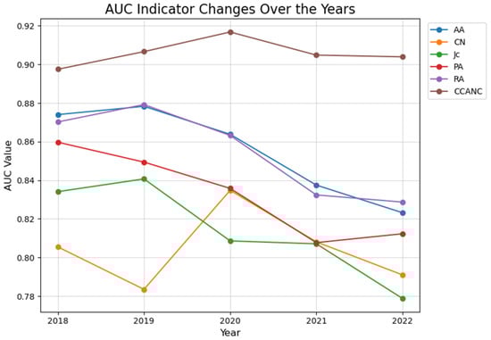 The primary indicators for evaluating the accuracy of link prediction algorithms are the AUC, precision, and ranking score, each of which focuses on different aspects of prediction accuracy [49,50]. Among these, the AUC and precision are the most widely used metrics; therefore, this paper will employ the AUC and precision as the evaluation metrics for the link prediction models.