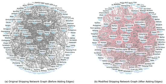- This study integrates both the centrality index and the clustering coefficient of ports into the link prediction algorithm. This allows the optimized route network to evolve towards decentralization, polycentricity, and enhanced connectivity. Rather than relying on a single hub port, the network now supports multiple central nodes, such as Laem Chabang Port, Manila Port, and Lianyungang Port. This optimization not only enhances the cargo-carrying capacity but also strengthens the service quality of key trade routes. Furthermore, links between peripheral ports (e.g., Subic Bay Port, Bintulu Port, Naha Port, Surabaya Port, Zhangzhou Port) are bolstered, reducing the reliance on transshipment and improving direct shipping efficiency. The introduction of new routes enhances the network’s resilience to disruptions, decreases the number of low-resilience and bottleneck ports, and fosters the creation of a more interconnected regional or subregional network. The increased connectivity has optimized the function of low-resilience ports, while bottleneck ports have gradually transformed into ’hub nodes’ by adding short-distance routes, thereby alleviating transport pressure and forming more efficient port clusters. This has led to an overall optimization in the efficiency of the regional route network.