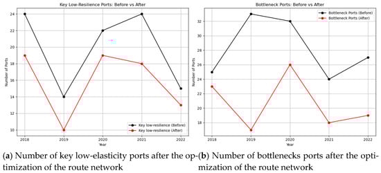 Considering the impact of the COVID-19 pandemic, the structure of the shipping network in 2020 was significantly affected by the outbreak, with several network indicators declining relative to 2019. However, by 2021, the network showed a rapid recovery, with many indicators surpassing pre-pandemic levels. The number of key low-resilience ports in 2020 was also lower than in 2018, suggesting that the pandemic’s impact on the shipping network was limited. This resilience can be attributed to East and Southeast Asia’s growing leadership in global shipping connectivity, which allowed major shipping routes between hub ports to remain relatively unaffected even during the pandemic. In contrast, European and North American shipping networks and ports faced greater disruptions due to pandemic control measures, which led to a decline in resilience. However, by 2021, the route networks in these regions began to recover, and port resilience was enhanced [52]. This further supports the idea that while short-term emergencies may temporarily disrupt the shipping network, long-term evolution is the main driver of structural changes in the route network [45]. In addition, this paper aims to improve the port resilience through shipping route optimization, so the feasibility of introducing new routes is also an issue worthy of attention. It usually takes 1–3 years for new shipping routes to be established, depending on the complexity of negotiations between shipping companies, port authorities, and governments and the need for infrastructure upgrades. The opening of a ship route will also involve a variety of issues: the impact on some transit ports (e.g., Singapore, Shanghai), changes in international oil prices, pressure to reduce emissions, the economics of the route (e.g., Yangon port to Dalian Port), and political links between the host countries (e.g., Subic Port to Jiangyin Port) [25,26,49]. In addition, different stakeholders need to work together, shipowners should examine possible routes, port authorities should plan for infrastructure upgrades as early as possible, and local governments need to balance environmental and strategic considerations. Therefore, it is also a research direction to study the feasibility of opening new routes from different aspects in the future.
