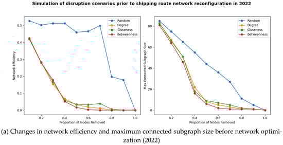 First, the network efficiency values and the sizes of the maximum connected subgraphs for the initial state of the route network in each year were calculated, as shown in Table 2. Subsequently, a disruption simulation of the route network was performed for each year, based on the ranking of the ports’ comprehensive structural indices. Figure 6, Figure 7, Figure 8, Figure 9 and Figure 10 illustrate the changes in overall network efficiency, and the size of the maximum connected subgraph as ports are progressively disrupted, according to their importance in the network. The horizontal axis denotes the chronological sequence of port removal according to the port’s structural importance, whereas the vertical axis reflects the resilience index. The disruption simulation demonstrates that the network efficiency and the size of the largest connected subgraph diminish with the removal of additional ports. The degree of impact from the consecutive disruption of ports differs annually, underscoring the variable resilience of the network based on the temporal context.