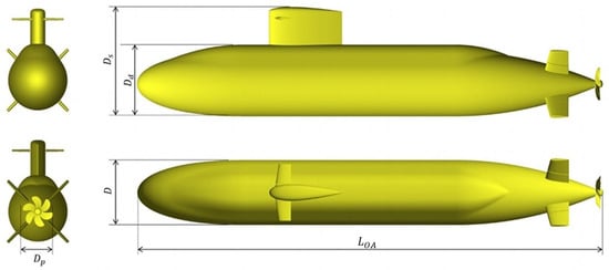 The target submarine is the generic submarine Joubert BB2 of MARIN (Maritime Research Institute Netherlands) [19,20]. Figure 1 shows the target submarine with all appendages attached, including a sail horizontal rudder, X-form rudder, and propeller. In this study, a 1/46.8 scaled model was used for the virtual captive model test, while a full-scale model was used for the seakeeping and maneuvering simulations. Table 1 summarizes the main specifications of the full-scale BB2 submarine. Figure 2 shows the various submergence depths (H/D) considered in this study. The submergence depth of a submarine is defined as the ratio of the distance from the free surface to the center of the pressure hull, H, to the diameter of the pressure hull, D. To confirm the hydrodynamic forces and motion changes occurring as the submarine approaches the free surface, numerical calculations were performed for H/D values of 1.30, 1.60, 2.00, and 5.00 (=deep water).