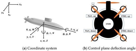 The target submarine is equipped with a sailplane at the bow and an X-form rudder at the stern. The sail plane generates control forces in the depth direction, while the X-rudder provides control forces in both horizontal and vertical directions. In the X-form rudder configuration, the horizontal maneuvering variable is the rudder deflection , while the vertical maneuvering variables are the stern plane deflections and . However, in this study, we focus on analyzing the motion of a submarine when it moves near the free surface in a horizontal plane. Therefore, forces in the Z-direction and the resulting moments are neglected. The resulting control forces can be described as follows in Equation (10):