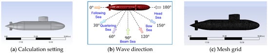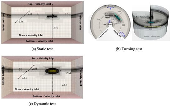 Table 3 summarizes the STAR-CCM+ virtual captive model test and static rudder test conditions in calm water. In this study, the focus was on the horizontal motion of the submarine. Therefore, the static rudder test was performed only at a deep water H/D of 5.00, while other tests were performed at H/Ds of 1.30, 1.60, 2.00, and 5.00 (deep water). Most of the tests were performed at a design speed of 1.5 kn, which corresponds to 10.0 kn at full scale. Here, , , and are the speed of the target submarine, drift angle, and rudder deflection angle, respectively. , ’, ’, and ’ are the respective non-dimensional yaw rate, sway acceleration, roll angular acceleration, and yaw angular acceleration.