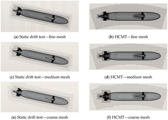 A grid convergence test was performed to find the optimal mesh; to this end, 3 mesh sizes were considered—fine, medium, and coarse—which are shown in Figure 5. For the comparison, static drift test (Drift angle = 12°) and horizontal circular motion test (HCMT) (Non-dimensional yaw rate = 0.5) tests were performed. The results of the grid convergence test are shown in Table 2. The grid convergence index (GCI) values for the medium and fine grid meshes were small and nearly identical. Therefore, considering the computational cost, the medium grid was selected. The represents the order of accuracy in numerical analysis, indicating how accurately the computational results converge as the grid size decreases. Table 2 shows that the p-value ranges from 0.99 to 2.05, suggesting that the grid convergence is generally well achieved and that the trend is consistent with the theoretical order of accuracy of the numerical method used. For the static drift test, the medium grid consisted of approximately 10.5 million cells, increasing to about 12 million cells when the free surface was included. In case of horizontal circular motion test, these values are 5.1 million and 6.0 million, correspondingly.