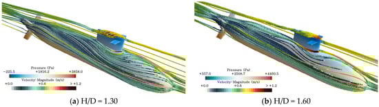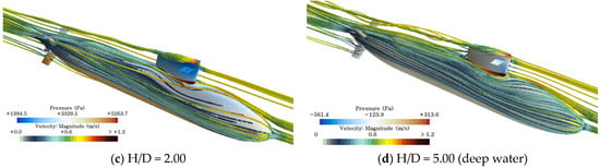 Streamlines and pressure distribution with submergence depths (Static drift test = 8°) [22].