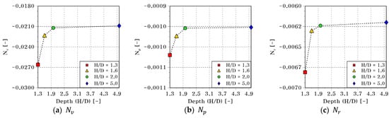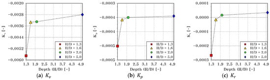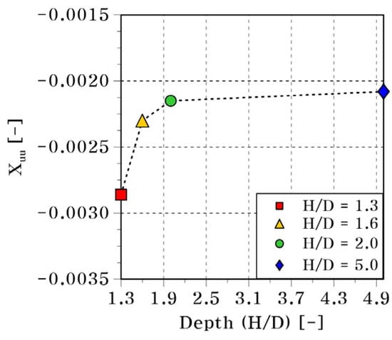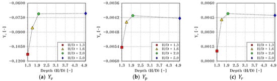 Figure 6 shows the streamlines and pressure distribution fields of the static drift test (Drift angle = 8°) for the visualization of the free-surface effect. Through these virtual captive model tests, it was confirmed that as the submarine approaches the free surface, the sail disturbs the free surface causing waves, which induces an increase in the hydrodynamic forces. However, since the influence of waves decreases exponentially as the submergence depth increases due to the Smith effect, the difference is insignificant when the H/D is 1.60 or higher. Figure 7,Figure 8,Figure 9 and Figure 10 show the variation in linear damping coefficients with submergence depths [22]. We can see how those coefficients increase as the submarine approaches the free surface when the H/D is 1.60 or lower.