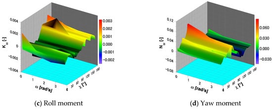Table 10 summarizes the ANSYS AQWA seakeeping simulation conditions. In this simulation, to calculate the non-dimensional mean wave drift forces in regular waves, the submarine speed , wave frequency , and wave direction are used as input parameters, and the H/Ds of 1.30, 1.60, and 2.00 were used. And the dimensional values are calculated by the wave amplitude for each wave frequency determined by the wave spectrum.