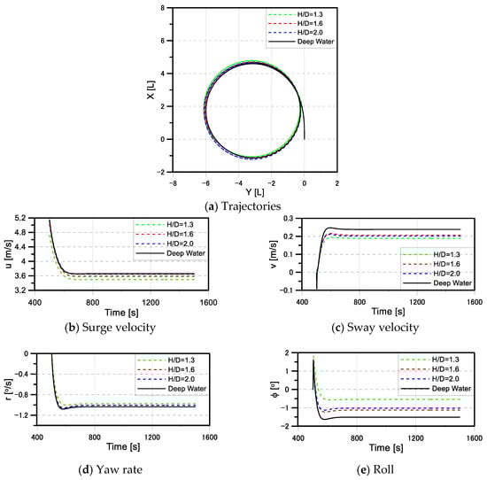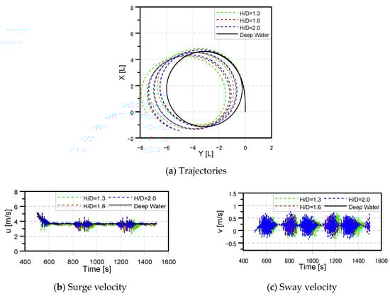 Figure 14 shows the results of the turning circle simulation in calm water. The differences in trajectory at the various submergence depths are small; however, as the submarine approaches the free surface, its sail disturbs the free surface by producing waves. This increases resistance, thereby reducing the surge velocity, sway velocity, and yaw rate.