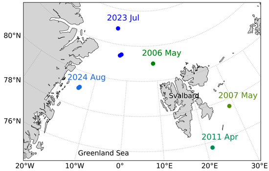 Map with the locations of ice stations during the GoNorth 2023 cruise, the Fram Strait 2024 cruise and the UNIS course cruises on Lance 2006, 2007 and 2011.