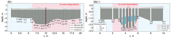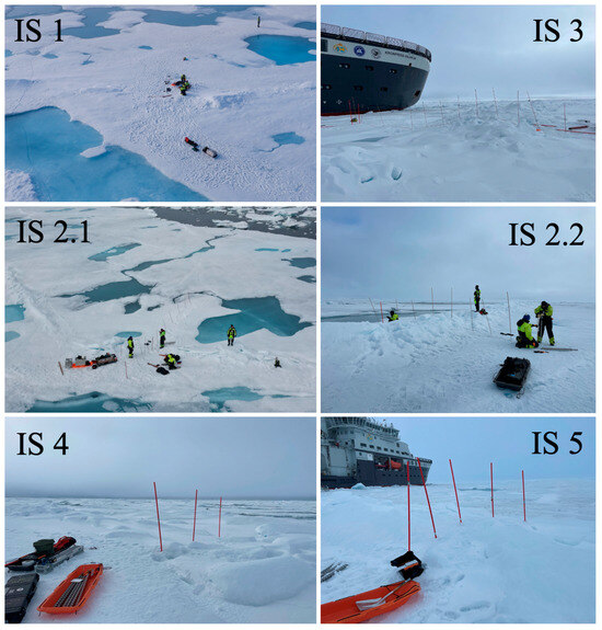 Figure 2 shows all five ice stations. On all the ice stations, the work was carried out across one ridge, but on the second ice station, two ice ridges were investigated. Moreover, on the last ice station (IS5), two cross sections were also sampled with a 4.5 m interval between them. The step length was determined by the ridge’s geometry and the melt pond’s location.