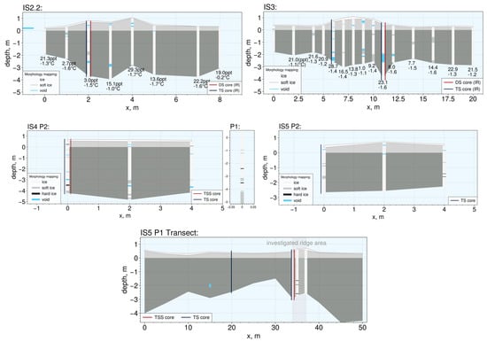 The ridge porosity was non-zero in both the keels and sails for almost all ridges except the fully consolidated ridge 1 and both transects from the last ridge. From the morphological mapping (Figure 3), it is observed that ice ridge 2.1 had a large void with water inside. This could be the outcome of the large block that formed it. At the same time, smaller voids were discovered closer to the top of the sail, which confirmed block/pore size distribution in the ridges—smaller on the top and inside the ridge, larger at the bottom and closer to the sides. In addition, from the sides of the ridge where we assumed there was level ice, there were some water layers. This can be explained by the melting of snow or the top ice layer, not refreezing of these melt ponds to the full extent and the occurrence of new snow/ice layer and repeating this process. If we look at the morphological maps (Figure 3) for IS2.2, IS3 and IS4, there were also larger voids closer to the ridge bottom compared with the top part of the ice ridge. And there were voids in the sail, which were not consolidated yet in comparison to old ridges. In all of them, there were places where void and soft ice were close to each other. When water is isolated by ice around it and when both have the same temperature, water has more energy compared with ice, so it starts to influence the area around it, making it softer. Ice can also make water slushy. When the area is not isolated and there is a heat flux, then it will be either freezing or melting. The porous structure of the ridges indicated that they were in the transition from the first to second year.