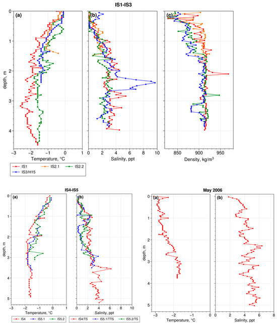 Examples of summer temperature (a), salinity (b) and density (c) (TSD) profiles for ice ridges 1–5, grouped by years (IS1–IS3—end of July 2023; IS4–IS5—middle of August 2024). An example of spring temperature, salinity profiles based on measurements from 2006. TS—temperature–salinity core, TTS—temperature–thin section core (more details in Appendix A, Figure A3).