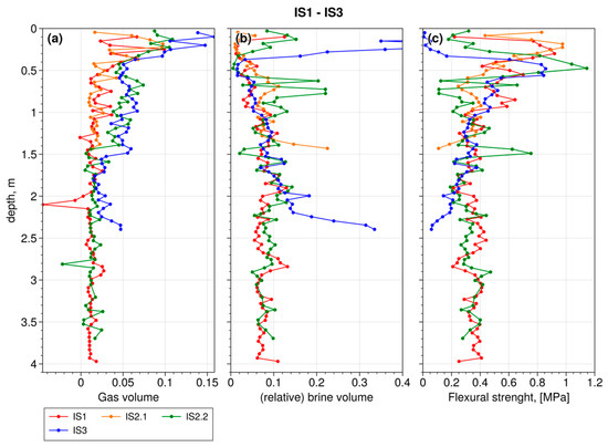 The gas (a)/brine (b) volume (Equations (2) and (3)) and flexural strength (c) (Equation (7)) for the GoNorth 2023 expedition. For calculation: temperature was taken from temperature core results, salinity and density were taken from density–salinity core.