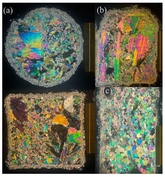Thin sections of ridge cores were sampled for IS4 and IS5.1. Typical vertical and horizontal profiles, granular ice profiles and many deformed ice profiles were observed, as seen in Figure 6. Figure 6a shows horizontal and vertical thin sections from IS4 at a depth of 285 cm. We see large crystals surrounded by granulated ice. This could be due to a deformation process with further new ice growing during the ridge’s “life” period or voids with new ice between different ice blocks. Also, the granular structure can be explained by floating snow that has been re-frozen. Figure 6b shows the structure of the ice ridge near its end, before the last 5 cm of ice. We can observe various structures with new ice growth in between. It can be a skeleton layer after some deformations and a new consolidation process. Figure 6c shows the transition between the initial skim and the transition zone/columnar zone. This part of the ice block was at a depth of 1 m from the top of the ridge. Looking at the salinity profile (blue color), shown in Figure 4, we can see changes in salinity at approximately the same depth. The ice blocks melted and froze again in the summer. Some water penetrated downwards before refreezing, and as a result, we see more granular ice in thin sections. This process is shown in Appendix A, Figure A4.