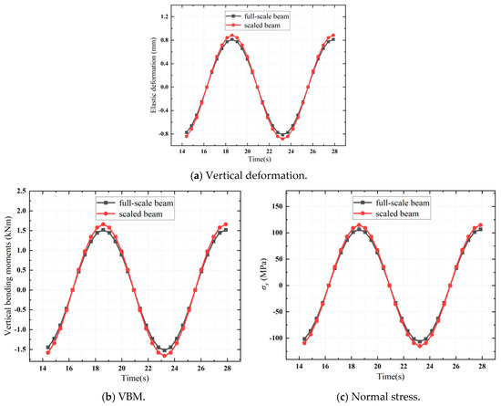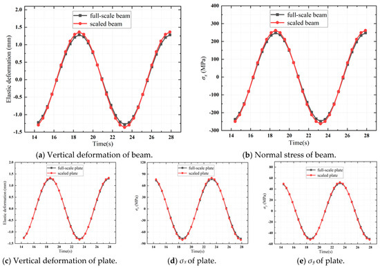 The purpose of scaled ship structural experiments is to directly predict the full-scale ship structural responses based on the measured physical quantities from these experiments. This subsection presents the scaling relations of physical quantities derived from the proposed combined similarity principle for plate structures. The vertical bending moment (VBM) and the normal stress for the scaled Euler–Bernoulli beam component are expressed as follows [16]: