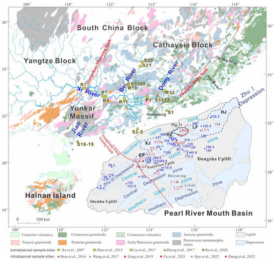 Simplified geological map of South China and the PRMB, depicting major modern river systems and the main tectonic elements (modified after [24]). Blue circles and blue numbers represent borehole locations that penetrated the crystalline basement, along with their dated magmatic ages from [11,38]. Red polygons with red labels indicate intrabasinal boreholes containing samples from the Enping Formation and detrital U-Pb ages [6,11,15,18,22,30]. Yellow polygons on the Pearl River and nearby coast represent samples from modern sediments, with references provided in the legend with different polygons [5,16,39,40,41]. Abbreviations: EP, Enping Sag; XJ, Xijiang Sag; HZ, Huizhou Sag; LF, Lufeng Sag; HJ, Hanjiang Sag.