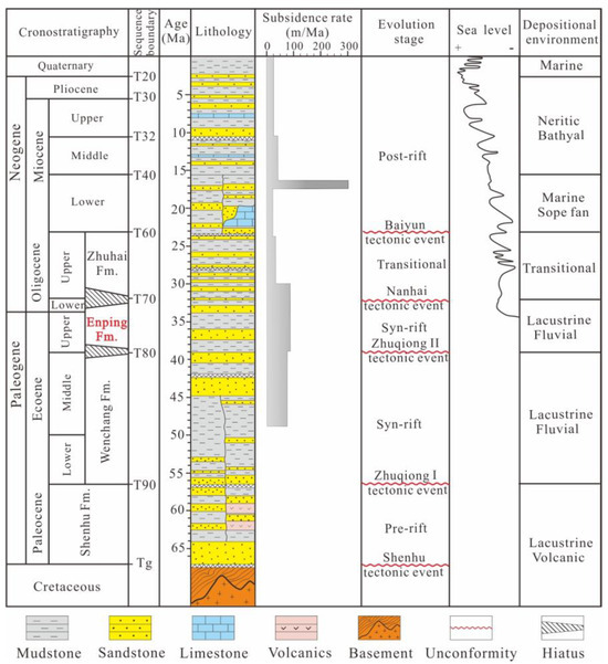Generalized stratigraphy of the PRMB (modified mainly after Fu et al., 2021), with the subsidence rate of the Zhu I Depression [47] and the sea-level curve [48].