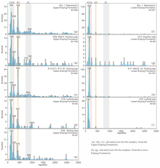 We collected all the published detrital U-Pb age data on the Enping Formation of the Zhu I Depression in the PRMB (Figure 1, Table 1). The analysis and comparison of the data reveal significant differences in the age spectra between the EpU and EpL unit (Figure 3). The detrital zircon ages of the EpL unit in each sag exhibit a simple composition, primarily dominated by the YS tectonomagmatic event. In contrast, the EpU unit displays a much more complex age distribution, indicating a change in provenance from the early to late stage.