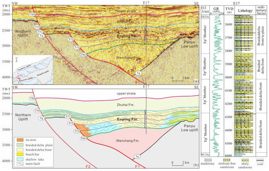 The Enping sag, located in the western part of the Zhu I Depression, exhibits typical characteristics of a half-graben, as illustrated in the profile (Figure 4a,b). Based on the well and seismic correlation, it can be divided into three layers from bottom to top, specifically the Wenchang Formation (Tg–T80), the Enping Formation (T80–T70), and the Zhuhai Formation (T70–T60). Within the Enping Formation interval, the Ep4 Member is locally absent from the Panyu Low Uplift, while both the Ep4 and Ep3 Members are missing on the northern faulted step zone (Figure 4). Well E17 indicates that the sandstone of the Enping Formation is predominantly medium-to-fine-grained, with a high sandstone content observed in the Ep1 to Ep4 Members, accounting for 47.73%, 69.59%, 49.61%, and 66.01%, respectively. The logging facies display a toothed box-shaped or funnel-shaped pattern in the gamma (GR) curve, and the stacking patterns primarily demonstrate vertical prograde accretions (Figure 4c).