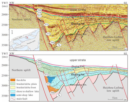 Seismic profile of the Enping sag and its interpretation, showing characteristics of early aggradation and late strong progradation. (a) Seismic profile from northwest to southeast across the Enping Sag. (b) Interpretation of sedimentary facies for (a).