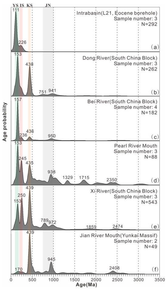 In the case of the Xijiang sag, all the U-Pb zircon ages analyzed are from the EpU unit. By comparison, its age spectrum exhibits the closest resemblance to the samples collected from the Pearl River estuary (Figure 3e and Figure 7d). However, it is important to note that the information conveyed by the Pearl River estuary samples represents a mixture of the northeastern and western Pearl River tributaries. When comparing the age spectra with those of the Dong River, Bei River, and Xi River (Figure 7b,c,e), it can be inferred that the Xijiang sag (Figure 3e) likely receives a higher input of detrital material from the northeastern Pearl River tributaries than the western Pearl River tributaries. This is indicated by the higher proportions of IS and KS zircons in the Xi River compared to the Bei and Dong River samples.