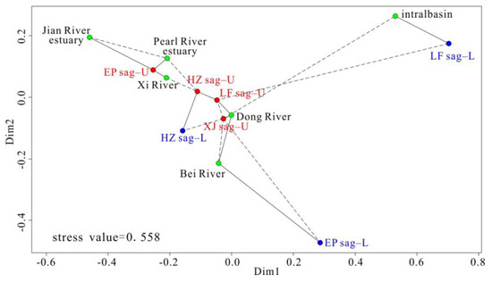 Multidimensional scaling (MDS) plot [53] for U-Pb ages of samples shown in Table 1, Figure 3 and Figure 7. The suffix “-U” represents samples from the upper unit of Enping Formation, and “-L” indicates samples from the lower unit of Enping Formation. The red, blue and green circles represents samples from EpU, EpL and modern rivers, respectively. Dissimilarity between samples is measured using Kolmogorov–Smirnov effect size. Solid and dashed lines represent the closest and second-closest neighbors, respectively.