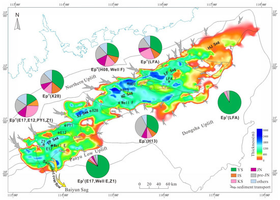 Additionally, the regional sediment influx direction, sedimentary system size, and thickness map of the Enping Formation indicate the presence of several large deposition and subsidence centers in the northern parts of the Xijiang, Huizhou, and Lufeng sags (Figure 9 and Figure 10). These sags are located closer to the SCB and were influenced by the peneplain landform during the deposition of the Enping Formation [31,60]. As a result, they were more likely to be influenced by the northeastern Pearl River distributaries. On the other hand, the western Enping sag is situated farther from the Pearl River estuary and is characterized by less-developed deposition and subsidence centers. This suggests that it could have received a greater input of detrital sediments from the spatially closer western Pearl River distributaries and the Yunkai Massif (Figure 1).