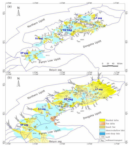 The northern Huizhou sub-sag is an important sub-sag with high hydrocarbon potential that has received considerable attention in recent years. During the Enping period, it represented the largest subsidence center in the Zhu I Depression (Figure 9). Additionally, structural transfer zones commonly existed among the northern boundary syn-sedimentary faults (such as the HZ08 transfer zone in the northern Huizhou sub-sag; [63]), steadily and continuously supplying sediments and leading to the formation of large-scale, braided river deltas (Figure 11b).