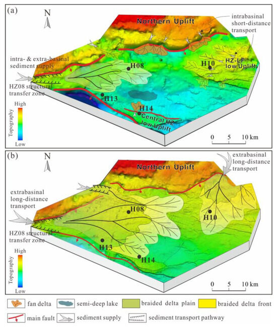 In the northern Huizhou sub-sag, significant changes in provenance, structure, and geomorphology occurred from the EpL to EpU period. During the EpL stage, the Central Huizhou Low Uplift (CHLU) and Huizhou–Lufeng Low Uplift (HLLU) served as the major intrabasinal sources for sediment supply. Small fan deltas developed in steep zones near the Northern Uplift and CHLU, while larger braided deltas formed in the eastern HLLU and the western HZ08 structural transfer zones. In the EpU stage, the low uplifts within the Huizhou sag gradually submerged and ceased to supply sediments (Figure 11). Simultaneously, extrabasinal provenance from the distant SCB became the dominant sediment source, replacing the intrabasinal sources. Small deltas were gradually replaced by large-scale braided deltas. Notably, the western structural transfer zone played a crucial role as a sediment transport pathway, contributing to the formation of a large-scale braided river delta system (Figure 11). It is also common throughout the entire Zhu I Depression to observe that structural transfer zones often act as efficient channels for debris transportation, resulting in the formation of larger-scale braided river deltas [31,68]. These sediments, sourced from outside the basin and transported over long distances, have a higher likelihood of forming potential high-quality reservoirs (Figure 12). Shallow-water deltas are similarly developed in the Paleogene Funing Formation of the Haian sag. Under the conditions of gentle slopes and abundant sediment supply, delta front sand bodies and high-quality reservoirs have developed well [69]. Additionally, the Enping Formation extensively contains coal-bearing source rocks within its lacustrine and delta plain facies [70]. These source rocks exhibit a favorable stacking relation with the widely developed lenticular delta front sand bodies, forming lithologic stratigraphic traps. The underlying Wenchang Formation has been proven to be a significant source rocks [71], while widespread mudstone developed in the Enping Formation acted as a potential local seal rock [24,26]. In other large petroliferous basins, such as the Ordos Basin, extensive coal seams and dark mudstones as source rocks, with diverse sandstones, created an effective source–reservoir–cap rock system, providing favorable conditions for hydrocarbon accumulation [72]. Consequently, the northern Huizhou sub-sag holds promising potential for oil and gas.