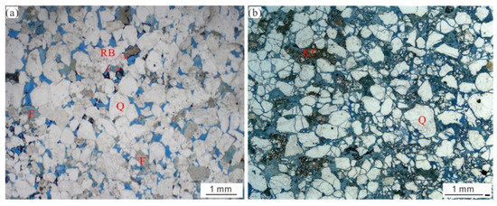 Microscopic images of polished thin sections from the upper unit of Enping Formation in the northern Huizhou sag. (a) Well H14: measured porosity 14.1% and permeability 9.3 md, 3638.1 m TVD, Ep1 Member; (b) Well H10: measured porosity 19.23% and permeability 47.9 md, 3129.0 m TVD, Ep2 Member. Pores in the sections are filled with blue epoxy resin. Abbreviations: Q, quartz; F, feldspar; Kf, K-feldspar; RB, residual bitumen.