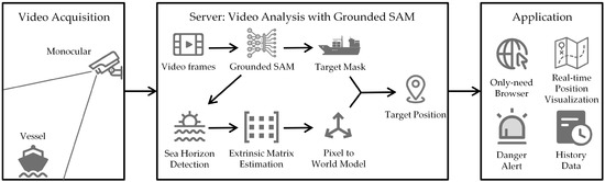 On the server side, the framework integrates several algorithms to ensure accurate processing and analysis of video data. First, Grounded SAM assists in detecting the sea horizon line from images, and thus, extrinsic parameters can be estimated based on the geometric features of the sea horizon line. Then, these parameters and the intrinsic parameters are used to build a coordinate transformation model to map pixel coordinates on the sea surface to world coordinates. In addition, the framework uses Grounded SAM for marine vessel target detection and instance segmentation to generate pixel masks for vessel targets in the surveillance area. Finally, the pixel positions are converted to world coordinates and distances by combining the coordinate transformation model with vessel masks. This workflow ensures the continuous identification of vessels that may pose a threat in the monitoring area and updates their coordinates and distances in real time.
