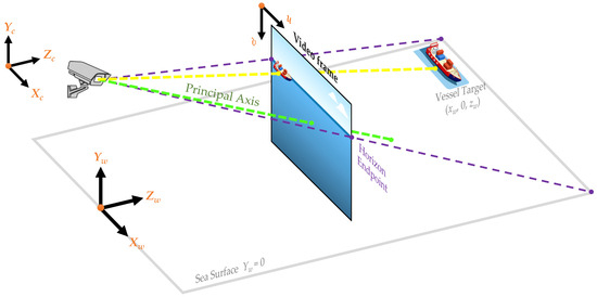 To obtain the position and distance of targets in an image, it is necessary to convert the 2D image coordinate system into the 3D world coordinate system. In this study, the intersection of the camera’s plumb line and the sea surface is set as the origin Ow. Based on the camera’s perspective, the Xw-axis points horizontally to the right, the Yw-axis points vertically upward, and the Zw-axis points horizontally forward. The origin of the camera coordinate system is set at the camera’s position, corresponding to (0, hc, 0) in the world coordinate system, where hc is the camera’s installation height. The axes of the camera coordinate system align with those of the world coordinate system. In the pixel coordinate system, the origin is at the top-left corner of the image, with the u-axis extending to the right and the v-axis extending downward. Figure 3 illustrates the monitoring scene and the basic setup of each coordinate axis while also explaining the geometric relationship between the pixel locations of targets in the image and their actual positions in the 3D world. Deriving the specific transformation method for this geometric relationship is key to calculating the position and distance of the targets.