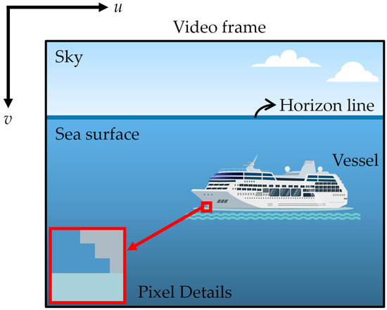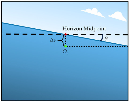 The position and angle of the sea horizon line in the image (Figure 6) can be used to estimate the camera’s extrinsic parameters, namely its pose. Extrinsic parameters include the rotation matrix and the translation vector relative to the world coordinate system. The translation vector can be directly obtained from the coordinate system settings described in Section 2.3.2.