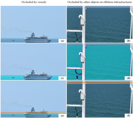 Examples of the sea horizon line ROI extraction steps: (a,b) original images and (c,d) ocean surface instance boundaries. The green line represents the completed boundary of the ocean surface instance after correction, while the blue line indicates the boundary before completion; (e,f) show the ROI (represented as a heatmap overlayered on the image) of the sea horizon line.