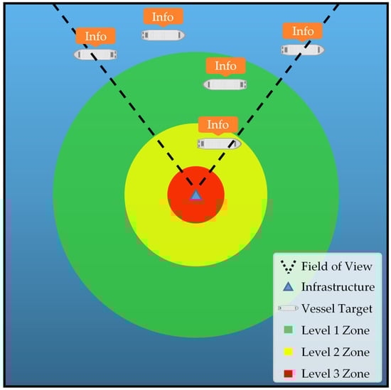 - Graded alert zones: circular alert zones centered around the protected offshore infrastructure, representing different levels of risk. These zones can be adjusted in shape or size according to specific operational needs, with each level indicating the proximity of objects to the infrastructure and the corresponding safety response required.