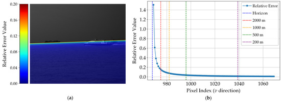 In this study, the experimental conditions are meticulously established to ensure the accuracy and reliability of the monocular distance estimation method. The camera was calibrated using Zhang’s calibration method, resulting in the intrinsic matrix K, as presented in Equation (22). Furthermore, based on the position of the sea horizon line in the case image and the extrinsic parameter estimation method (Equations (11)–(15)) detailed in Section 2.4.2, the camera’s roll and pitch angles were accurately determined as θ = 2.012° and ϕ = −2.326°, respectively. These intrinsic and extrinsic parameters serve as fundamental inputs for the subsequent error analysis.